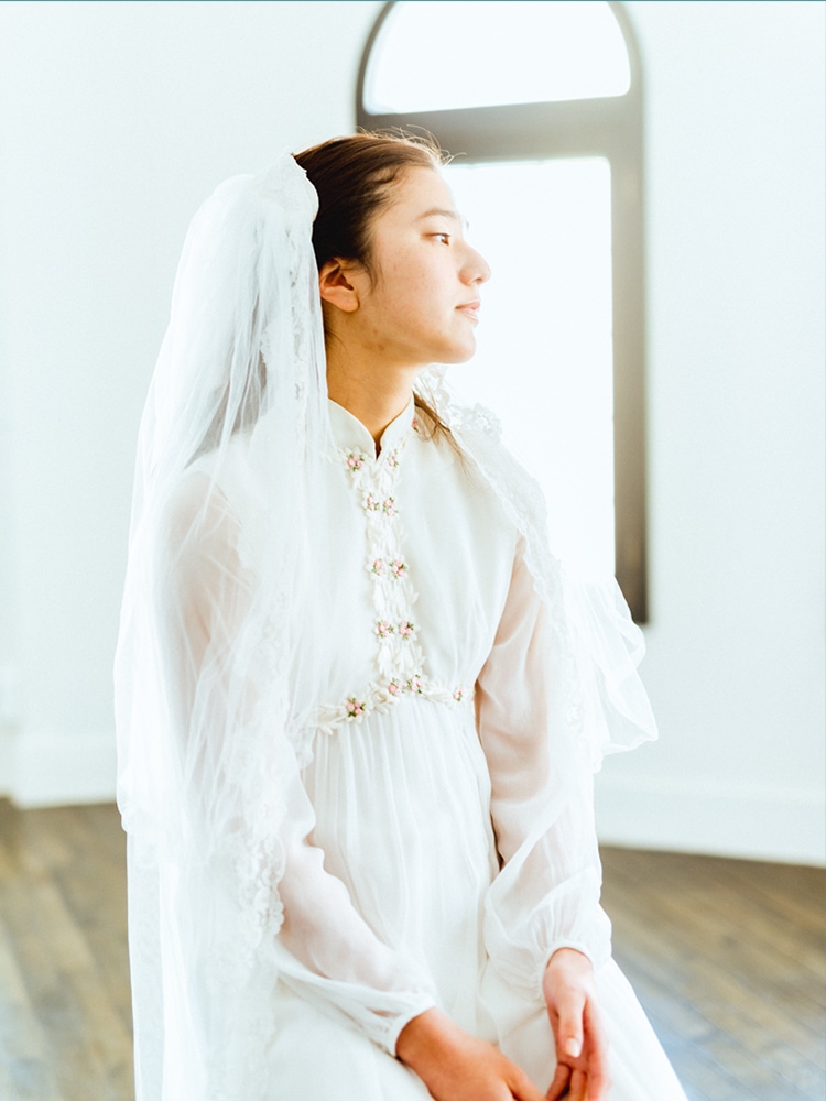 ロングベールのサイドに施された繊細なレースが一層引き立つ。