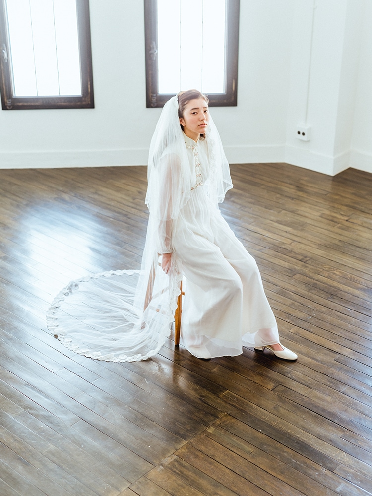 70年代の映画女優のようなマニッシュスタイルがとても新鮮。ウェディングでも自分らしい個性を大事にしたい女性にぴったり。