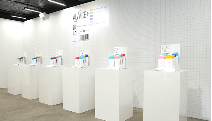 フェイスマスクがずらりと並ぶステージ×フォトスポット。洗練されたパッケージデザインはインテリアとしても映えます!