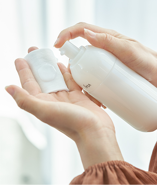 STEP 01 コットンにディスペンサー3プッシュ分のMEをとります。コットンを中指と薬指に乗せ、しっかり挟みます。