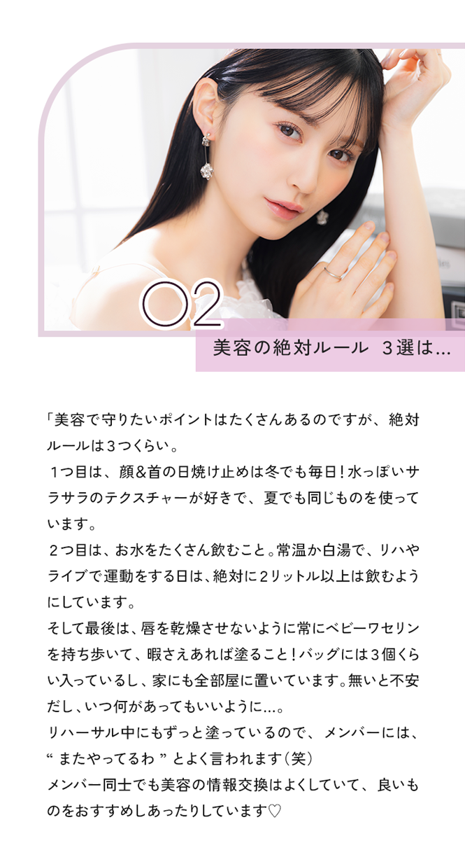 マイ・ルールで毎日の美容ケアを♥ 01 美容ケアのルーティンは、朝と夜で仕上げを変える 私は美容には結構マイルールがあって、今日のメイクも、最後のアイライナーの仕上げは自分で、アイドルメイクの時も絶対に自分で仕上げをします。ライブの時はラメを多めにして、リップの色も濃いめに。プライベートでは逆に、ナチュラルで柔らかい印象に仕上げることが多いです 03 良事とストレッナも、ゆるつとマイルール 食生活では、感覚でバランスをとるように気をつけています.例えば.甘いものを食べ過ぎてるなと感じたら、果物に変えるとか