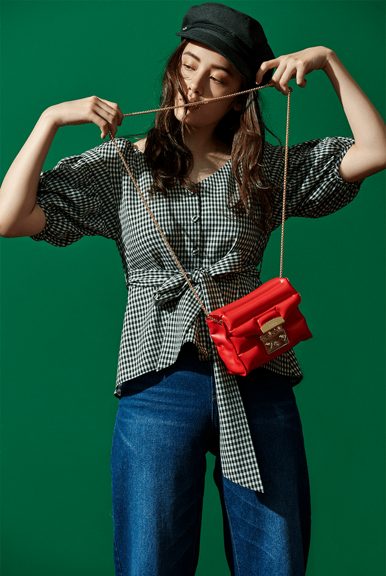 「メトロポリス」にこんなポップな夏らしいモデルも登場。まるで浮き輪のように中に空気が入った遊び心あふれるPVC素材を使用して涼しげな見た目がキュート。 (バッグ¥23,760/フルラ ※FURLA 銀座・FURLA ハービスPLAZA ENT・オンラインストア限定アイテム) www.furla.com