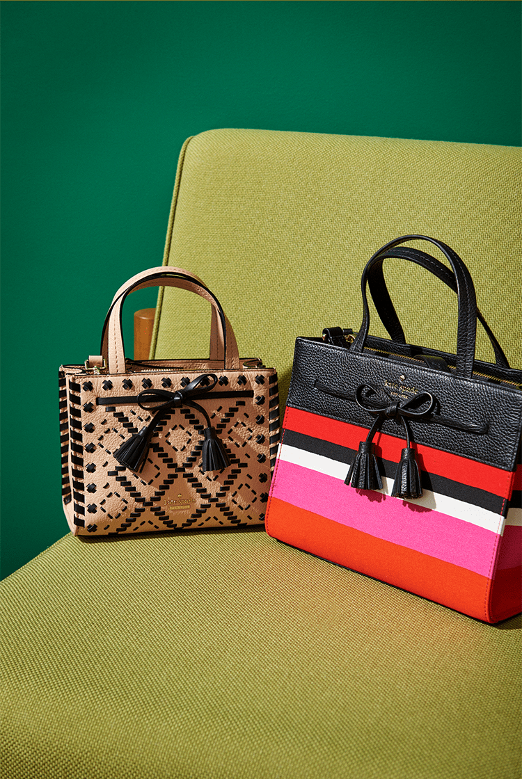 タッセル付きのリボンがアクセントになり大人可愛い夏コーデの主役トート。緻密にデザインされたメキシカンテイストの模様やカラフルなストライプ柄が洗練された大人な装いを叶えてくれます。 (バッグ左¥56,160、右¥57,240/ケイト・スペード ニューヨーク) www.katespade.jp