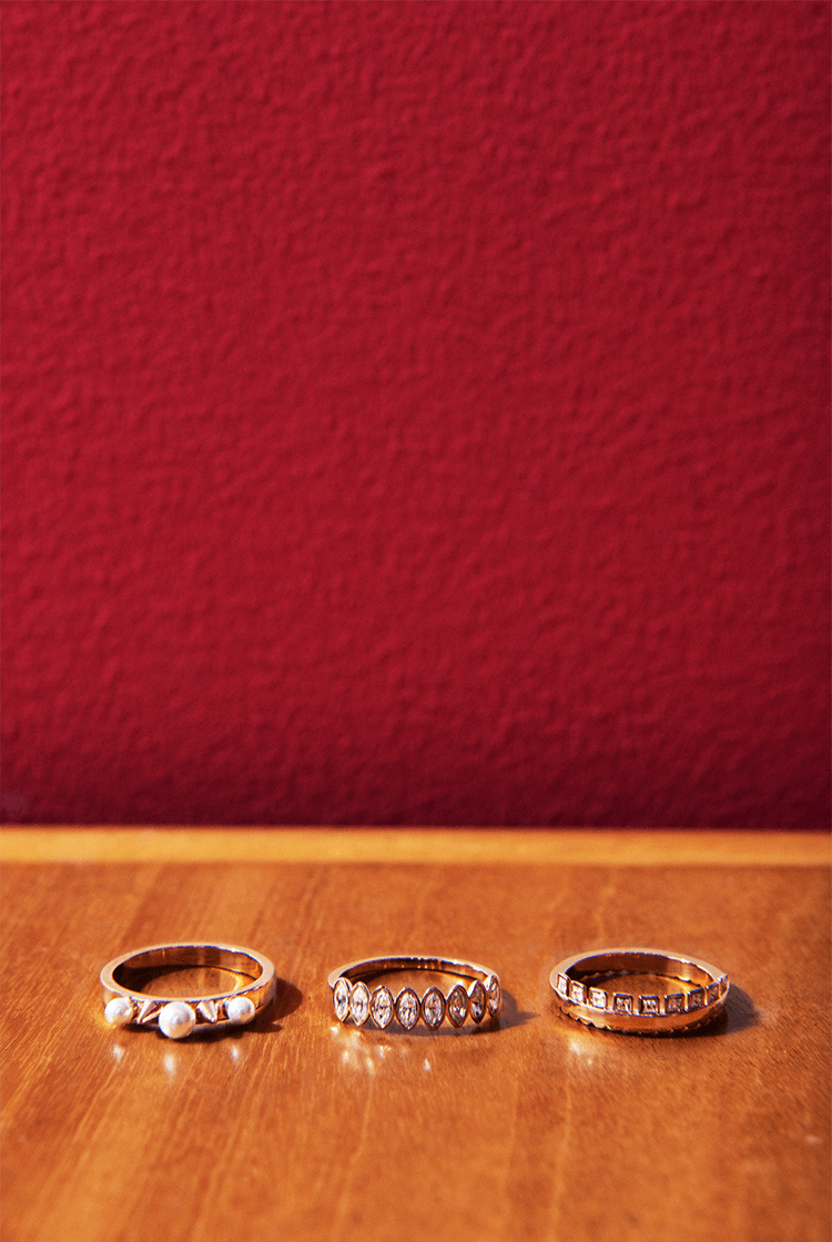 クリスタル・パールとクリスタルが施されたリングの3点セット。全て同じ指に重ねて付けたり1本ずつ違う指に付けたり、付け方を変えてお好みの表情を楽しんで。 (リング¥25,596/スワロフスキー・ジュエリー) www.swarovski.com