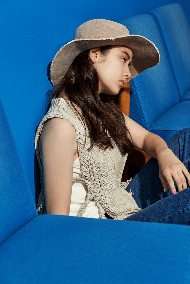 日差しの強い夏コーデに欠かせないハット。今年は、一気にこなれ感を投入してくれる、ツバの先端がフリンジのこんなヴィンテージライクな雰囲気のデザインハットを取り入れるのはいかが。 (ハット¥4,838、サマーニット¥12,960/アメリヴィンテージ) amerivintage.co.jp
