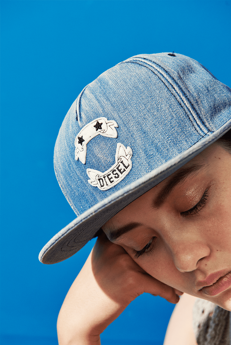 夏の元気コーデの仕上げにはデニムキャップを投入!ほど良く色落ちしたデニムの風合いがお洒落。無地のカットソーなどに合わせるだけでぐっとこなれた装いが完成します。 (キャップ¥10,584/ディーゼル) www.diesel.co.jp