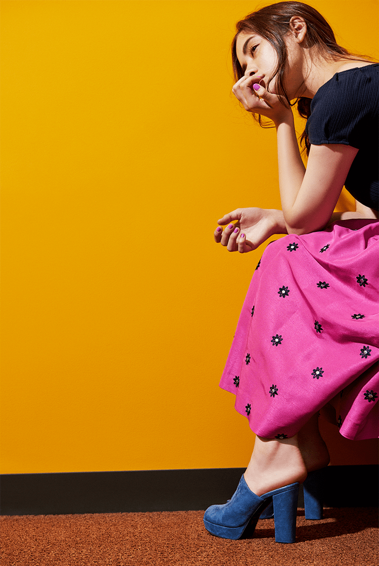 シンプルなネイビーのスエードのミュールは、太めのヒールで今どきシルエット!安定感もあり足を細く長く見せてくれるのもポイント高い。 (サンダル¥13,500/プールサイド) www.shoesconcierge.jp